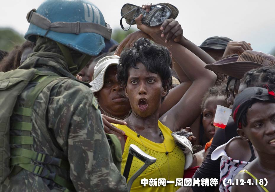 4月12日周一,海底太子港一个无家可归的地震幸存者与前来分发食品的巴西联合国维和人员发生口角。