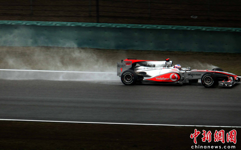 4月18日下午,2010国际汽联F1世界锦标赛上海站在上海国际赛车场举行正式比赛,迈凯轮车队的英国车手巴顿在雨中获得冠军、队友、英国车手汉密尔顿获得亚军,梅赛德斯GP车队的德国车手罗斯伯格获得季军。图为汉密尔顿。中新社记者 任晨鸣 摄