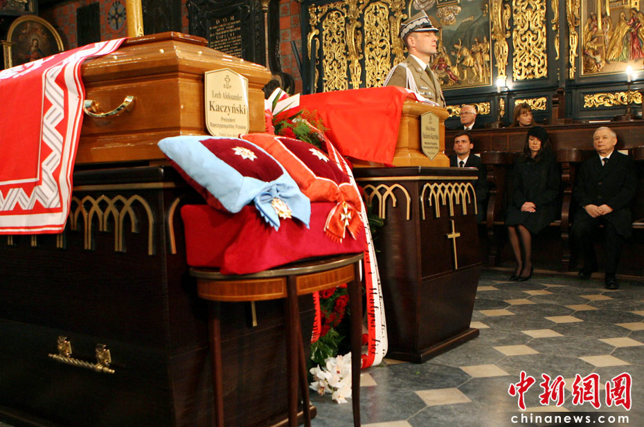 当地时间4月18日,卡钦斯基夫妇的葬礼在波兰南部城市克拉科夫举行。波兰总统卡钦斯基及其夫人乘坐的专机10日在俄罗斯斯摩棱斯克失事,机上人员全部遇难。图片来源:中国新闻网