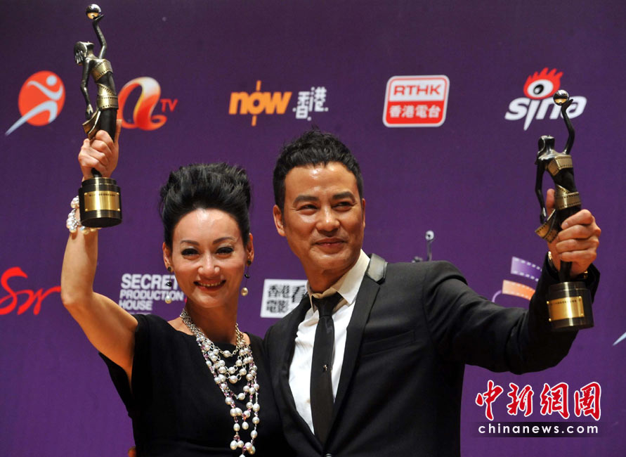 4月18日晚,“第二十九届香港电影金像奖”颁奖典礼在香港文化中心大剧院隆重举行。分别夺得最佳男女主角奖项的香港艺人任达华及惠英红向媒体展示奖项并合照。中新社发 邓庆乐 摄