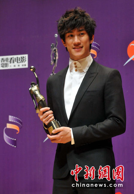 4月18日晚,“第二十九届香港电影金像奖”颁奖典礼在香港文化中心大剧院隆重举行,新晋演员李治廷凭演出电影“岁月神偷”夺得最佳新演员奖项。中新社发 邓庆乐 摄