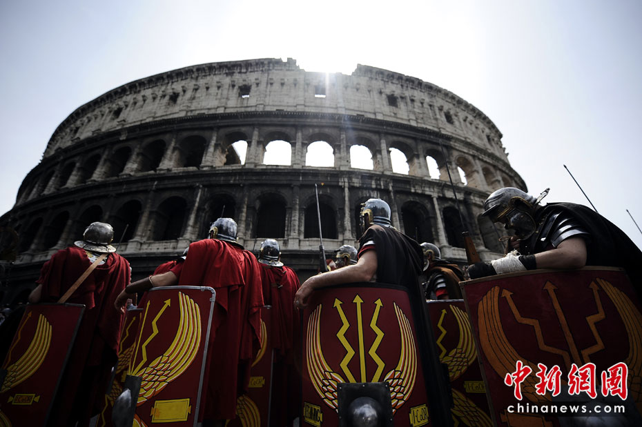 4月18日,意大利罗马,男子打扮成武士在圆形竞技场附近参加游行,庆祝罗马建城2763周年。图片来源:中国新闻网
