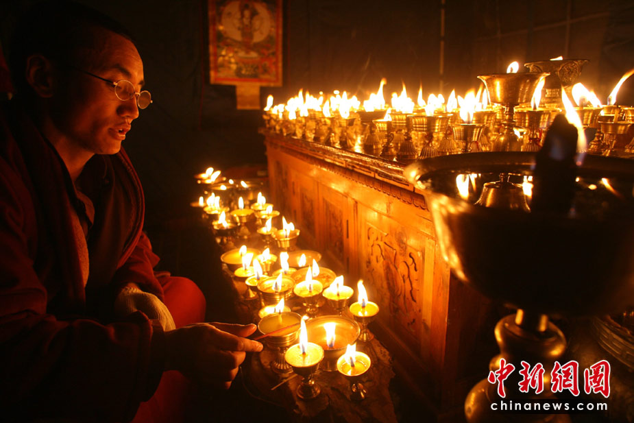 4月18日晚,玉树僧人为地震遇难者供灯。当日,民众自发在结古镇格萨尔王广场举行酥油灯法会,悼念地震遇难者。中新社发 苏丹 摄
