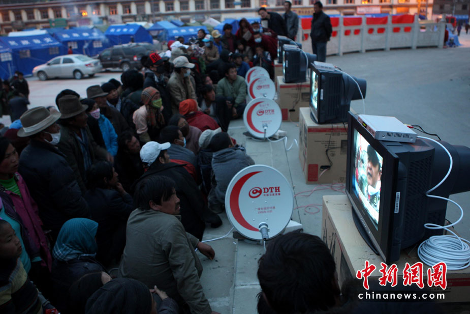 4月18日,青海玉树结古镇格萨尔王广场,青海玉树广电系统为受灾民众安装了4台电视机,直播震灾救援的最新进展。中新社发 盛佳鹏 摄