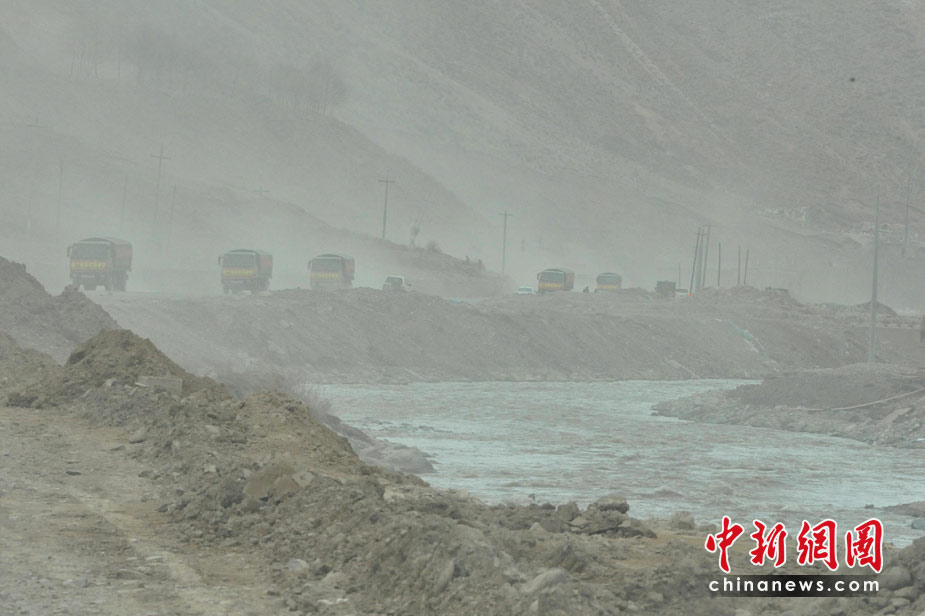 4月中旬青海玉树地震灾区风沙迷漫,中国各地军民车队在风尘滚滚中驰援青藏高原偏僻一角的玉树,艰难开通抗震救灾大通道。中新社发 贾国荣 摄