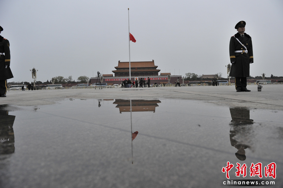 4月21日早晨,北京天安门广场下半旗向玉树地震遇难者致哀。中新网记者 金硕 摄