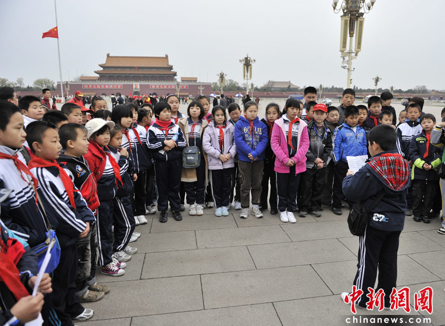 4月21日清晨,廊坊第十二小学的小学生来到天安门广场朗读自己的作文悼念青海玉树地震的遇难同胞。中新网记者 金硕 摄
