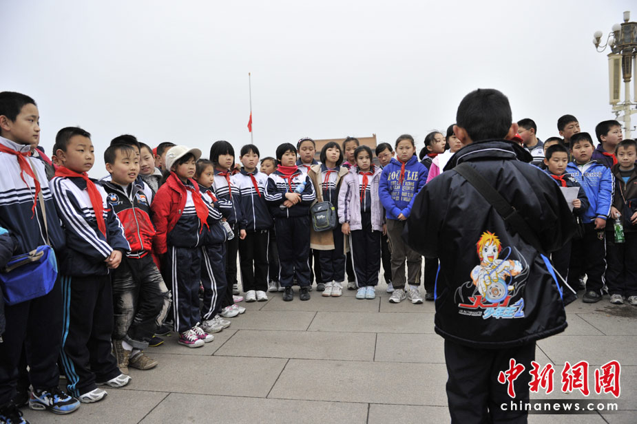 4月21日清晨,廊坊第十二小学的小学生来到天安门广场朗读自己的作文悼念青海玉树地震的遇难同胞。中新网记者 金硕 摄