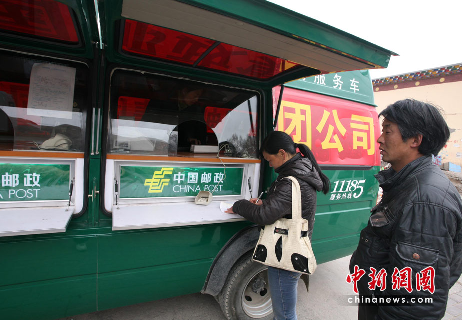 4月20日,宁夏邮政抗震救灾突击队六辆全电子移动邮政业务车开进玉树地震灾区,开始受理市民信函、金融等业务办理,目前玉树城内已有多家银行机构和商业网点开始恢复营业。图为玉树街头市民正在排队办理邮政业务。中新社发 刘忠俊 摄