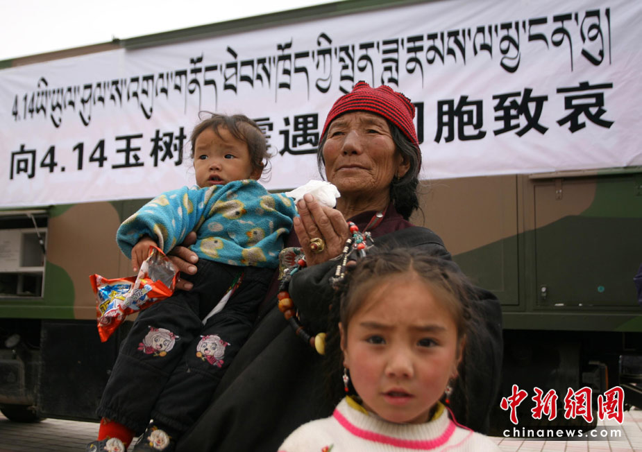 4月21日,为表达全国各族人民对青海玉树地震遇难同胞的深切哀悼,举行全国哀悼活动。玉树的悼念活动在结古镇举行,在玉树体育场、赛马场、格萨尔广场等安置点,当地民众和救援部队自发举行哀悼活动。中新社发 刘忠俊 摄