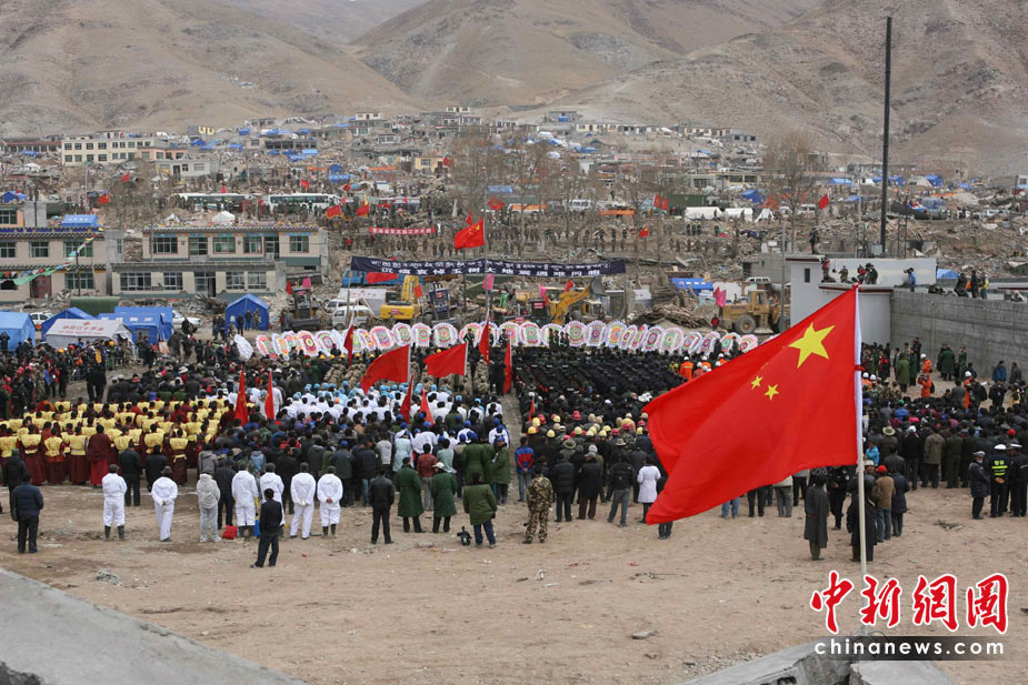 4月21日,为表达全国各族人民对青海玉树地震遇难同胞的深切哀悼,中国国务院决定,举行全国哀悼活动。图为青海玉树当地民众在玉树县结古镇镇政府举行哀悼活动。中新社发 苏丹 摄