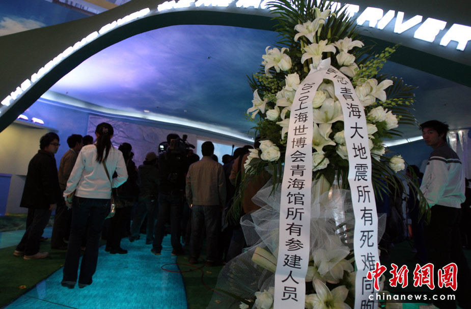 4月21日10点,上海世博青海馆举行仪式哀悼玉树地震遇难者。当日,全国举行哀悼活动,深切哀悼青海玉树地震遇难同胞。中新社发 汤彦俊 摄