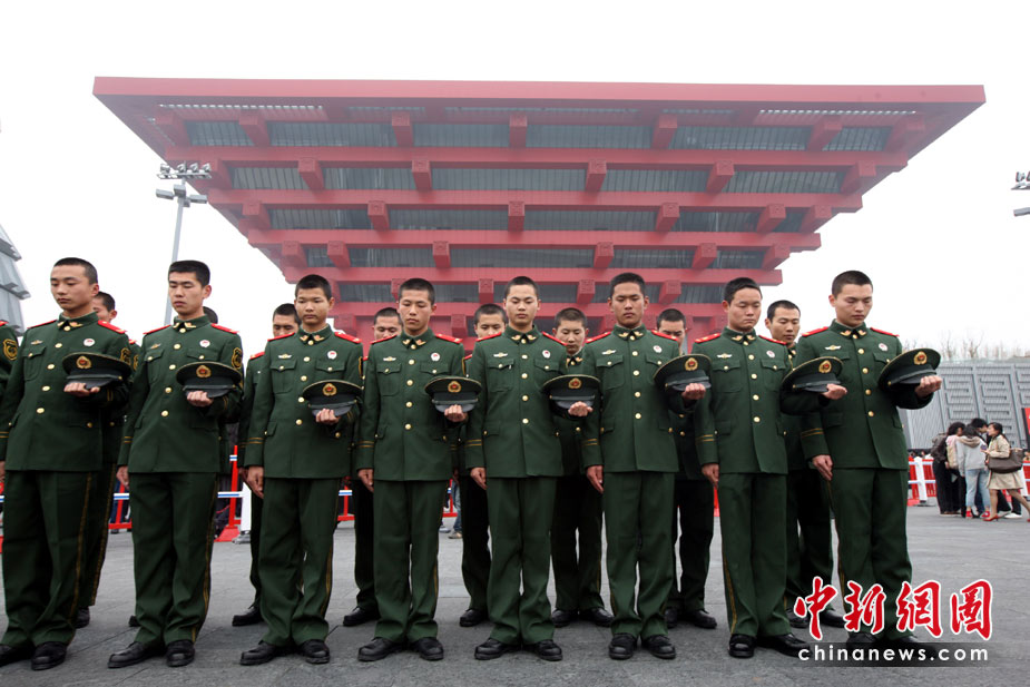 4月21日,上海世博园中国馆前,负责警卫工作的武警官兵向玉树灾区遇难同胞肃立默哀。当日,全国举行哀悼活动,深切哀悼青海玉树地震遇难同胞。 中新社发 张雷 摄