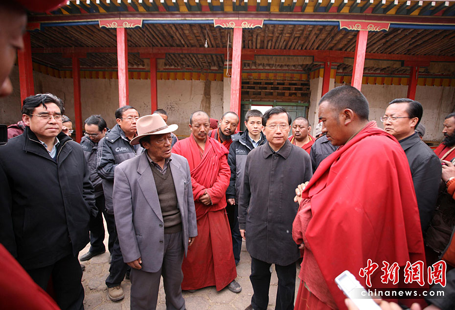 4月21日,青海省委书记强卫来到玉树县结古镇结古寺,亲切看望慰问受灾僧侣,并详细了解了结古寺受灾情,强卫对寺管会在地震发生后参与抗震救灾给予了高度评价。中新社发 刘忠俊 摄