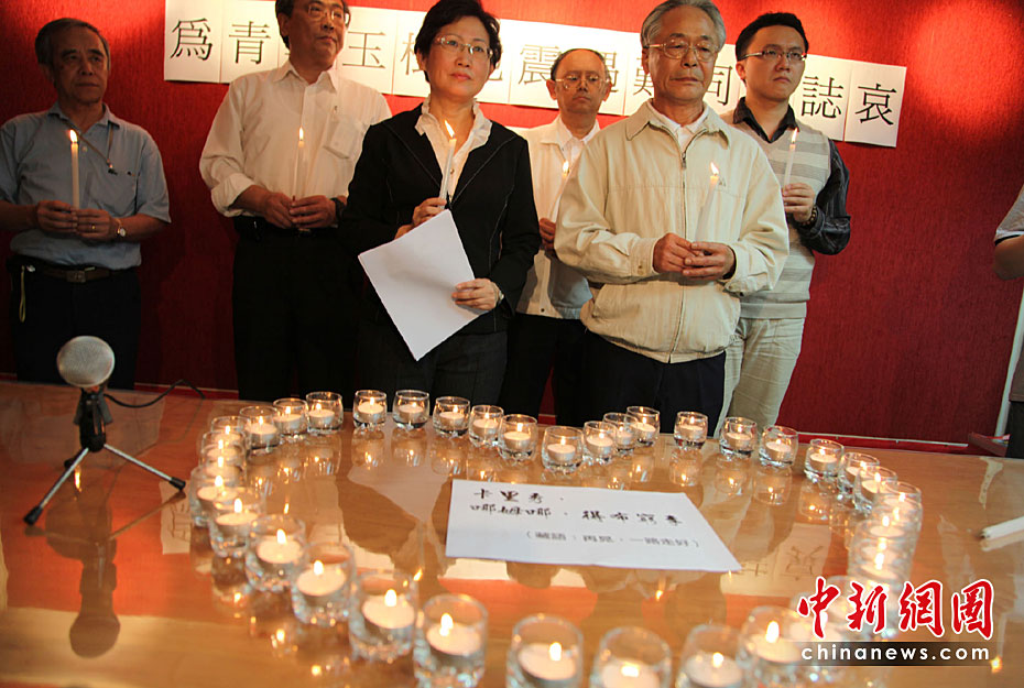4月21日晚7时,中国统一联盟在台北以点燃蜡烛、3分钟默哀、宣读哀悼文等形式,与大陆同胞一起哀悼玉树强震罹难者。前左为“统盟”主席纪欣,前右为劳动党主席吴荣元。中新社发 董会峰 摄