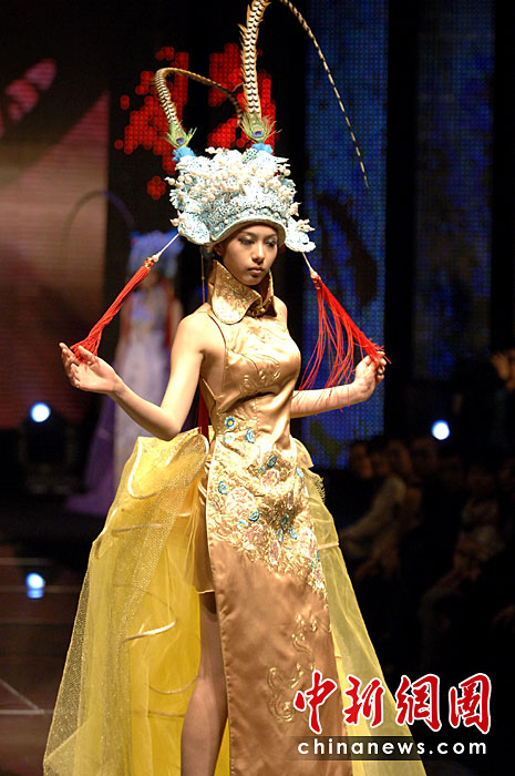 4月20日晚,首届海西国际时装周在福建石狮闭幕,本届时装周吸引了来自海峡两岸的纺织服装界企业家和知名服装设计师。期间举办了12场时装品牌和设计师作品动态发布会。图为模特展示古今潮流结合的服装。王东明 摄