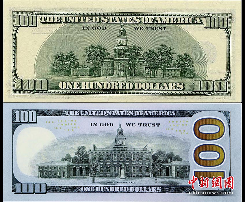 4月21日,美国财政部和美联储共同发布新版100美元面值的纸币票样。此次发行新版百元美钞旨在防范假钞,同时,老版美元仍将继续流通。图片来源:中国新闻网