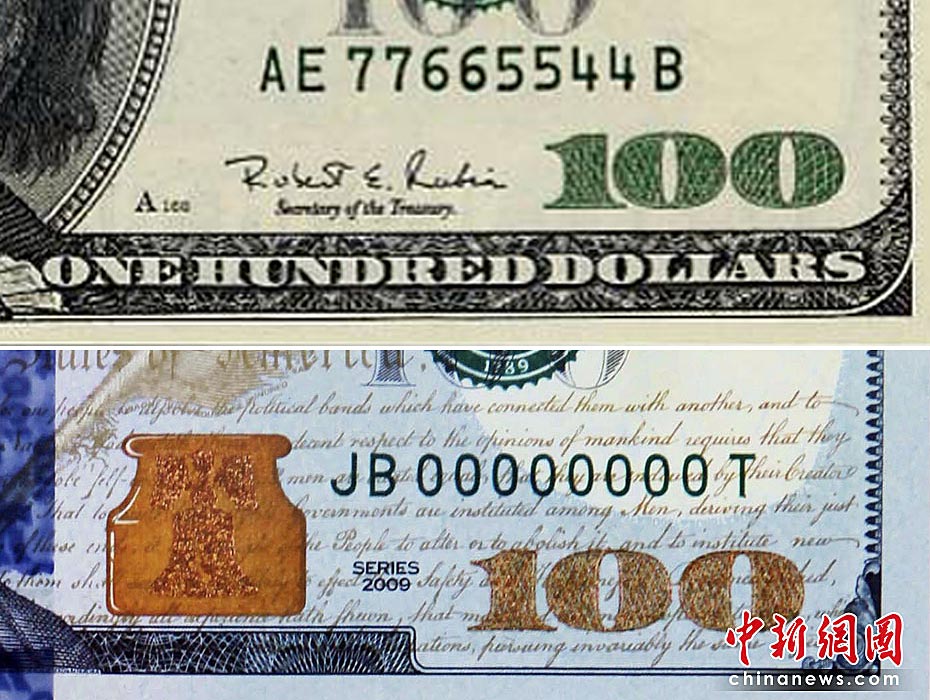 图为新(下)旧款百元美钞对比。