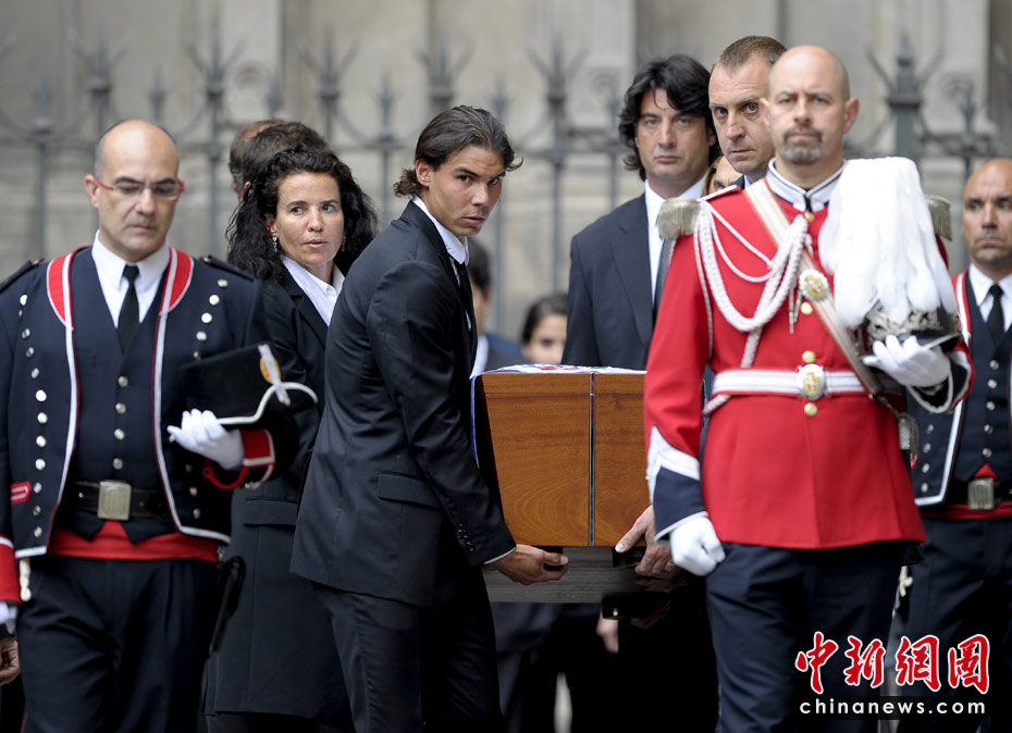 西班牙当地时间4月22日18时,国际奥委会终身名誉主席萨马兰奇的葬礼在巴塞罗那举行,包括西班牙国王夫妇、现任国际奥委会主席罗格、F1车手阿隆索、巴萨俱乐部主席等在内的政界和体育界4000多人出席,网球名将纳达尔等负责抬灵柩,送别萨翁最后一程。 图为西班牙网球明星纳达尔忍悲痛抬棺木。