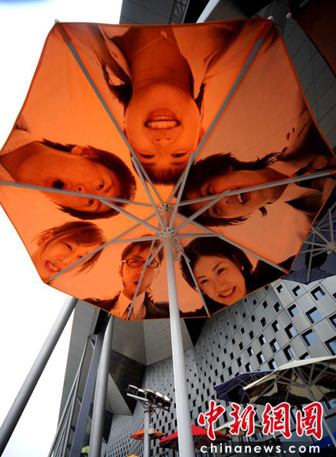 2010年4月22日,上海世博会主题馆门前的观众等候区,竖立着一把把遮阳的花伞,每一把花伞上都印着四方友人的灿烂微笑。世博园区为了应对大量客流,园区设置了大量遮阳和避雨设施,遮阳避雨面积总量达40万平方米。杨毅 摄(CFP)