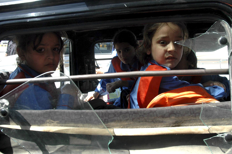 周一(19日),巴基斯坦白沙瓦发生炸弹爆炸事件。图为学生坐在炸弹攻击后的车内。