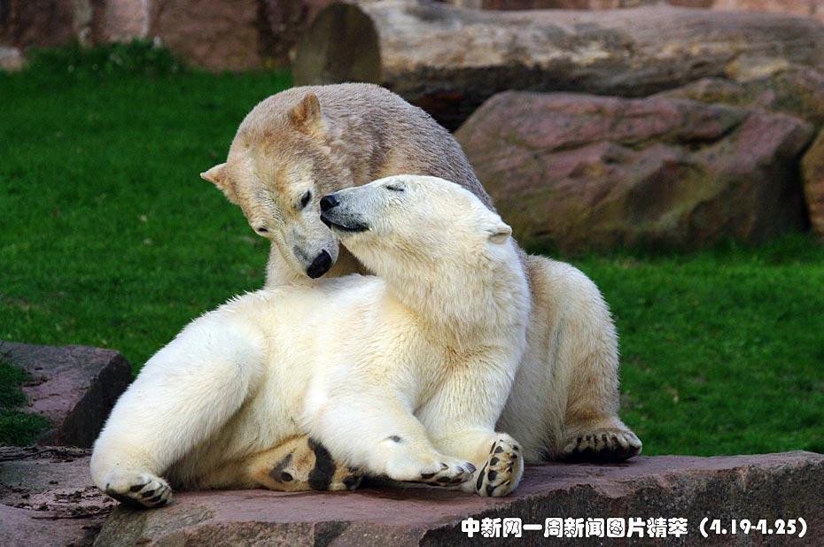 周五(23日),德国纽伦堡动物园内,两头北极熊在公园内的水池中尽情玩耍,享受春天的阳光。