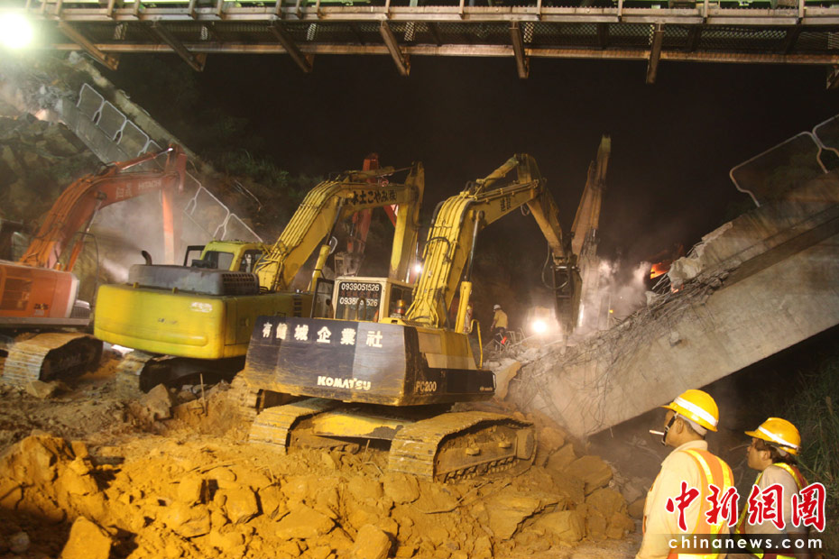 4月25日, 台湾一条交通要道、“北二高”基隆段发生山崩意外,倾泻而下的土石压垮一座高架桥,并覆盖道路约200米,据传有人车被埋。图为工程人员连夜开挖,展开大搜救。 中新社发 董会峰 摄