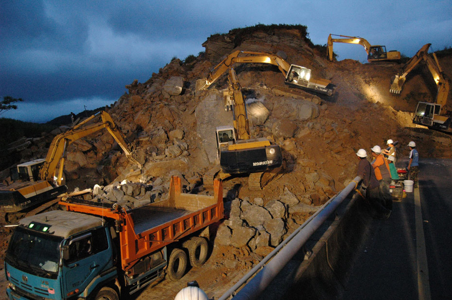 4月25日, 台湾一条交通要道、“北二高”基隆段发生山崩意外,倾泻而下的土石压垮一座高架桥,并覆盖道路约200米,据传有人车被埋。图为工程人员连夜开挖,展开大搜救(图片来源:“中央社”)。
