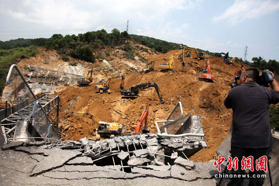 4月26日,台湾“北二高”基隆段山崩断桥意外第2天,工程人员继续开挖,将拦腰被斩断的路桥拆除,但尚未寻获被埋的数辆人车。图为当日中午,记者另绕山路爬上断桥拍到的情景,依然触目惊心。中新社发 董会峰 摄