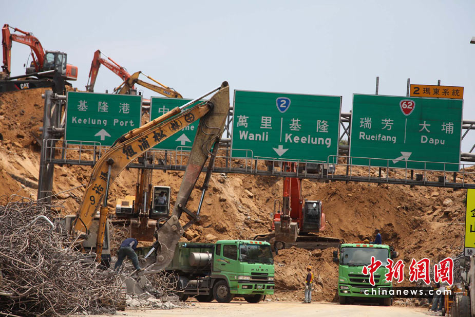4月26日,台湾“北二高”基隆段山崩断桥意外第2天,大批工程人员使用近50台怪手持续开挖,但尚未寻获被埋的车辆和失踪者。这起“走山”断桥意外发生在25日,一座高百米的山坡全然崩坍,土石覆盖道路长约200米、面积达3个足球场之大,令南下北上的交通大受影响。 董会峰 摄