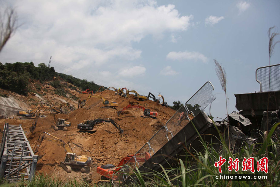4月26日,台湾“北二高”基隆段山崩断桥意外第2天,大批工程人员使用近50台怪手持续开挖,但尚未寻获被埋的车辆和失踪者。这起“走山”断桥意外发生在25日,一座高百米的山坡全然崩坍,土石覆盖道路长约200米、面积达3个足球场之大,令南下北上的交通大受影响。 董会峰 摄