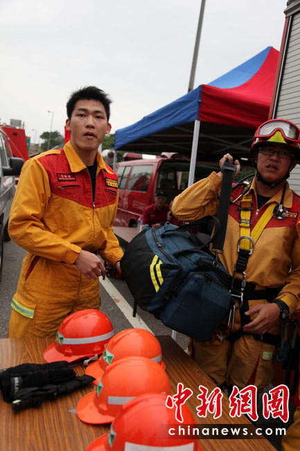 4月26日,台湾“北二高”基隆段山崩断桥意外第2天,大批工程人员使用近50台怪手持续开挖,但尚未寻获被埋的车辆和失踪者。这起“走山”断桥意外发生在25日,一座高百米的山坡全然崩坍,土石覆盖道路长约200米、面积达3个足球场之大,令南下北上的交通大受影响。 图为特种搜救队员在现场待命。 董会峰 摄