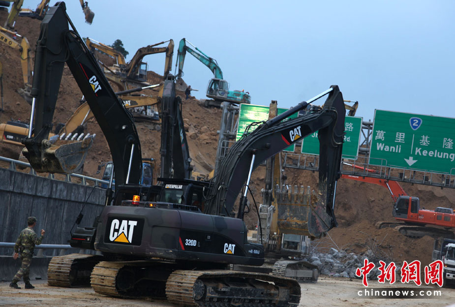 4月27日,台湾“北二高”基隆段山体大滑坡意外第3天,开挖搜救风雨无阻、持续进行,消防部门陆续接获民众报告,疑似5车6人被深埋,包括两辆奔驰轿车、一对年轻情侣。图为军方出动大型机械车参与挖掘工作。中新社发 董会峰 摄