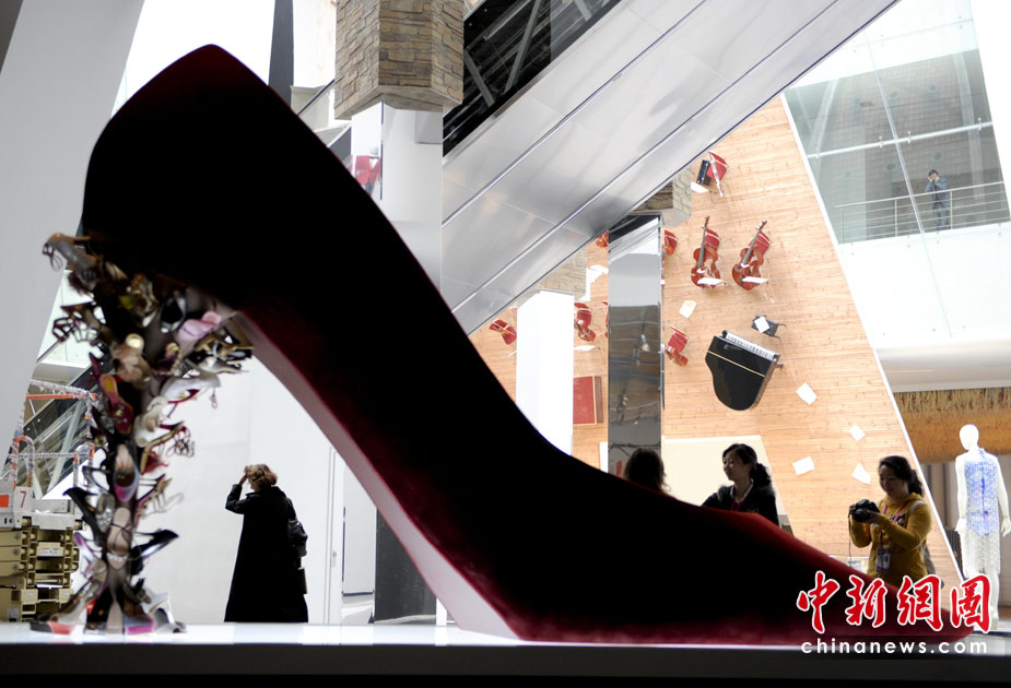 4月27日,一位外国女士走过上海世博园意大利馆内的高跟鞋展品。中新社发 廖攀 摄