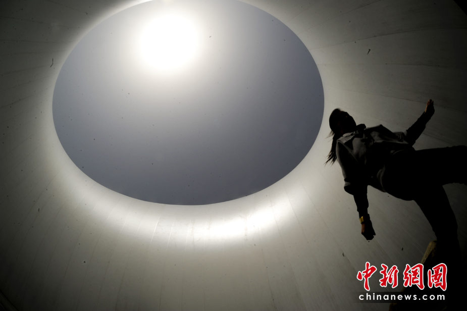4月27日,一位女士走过上海世博园芬兰馆的圆形天井。中新社发 廖攀 摄