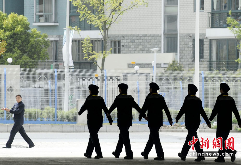 4月27日,上海世博园里一队女性安保人员走过引起一旁的男士侧目。中新社发 廖攀 摄