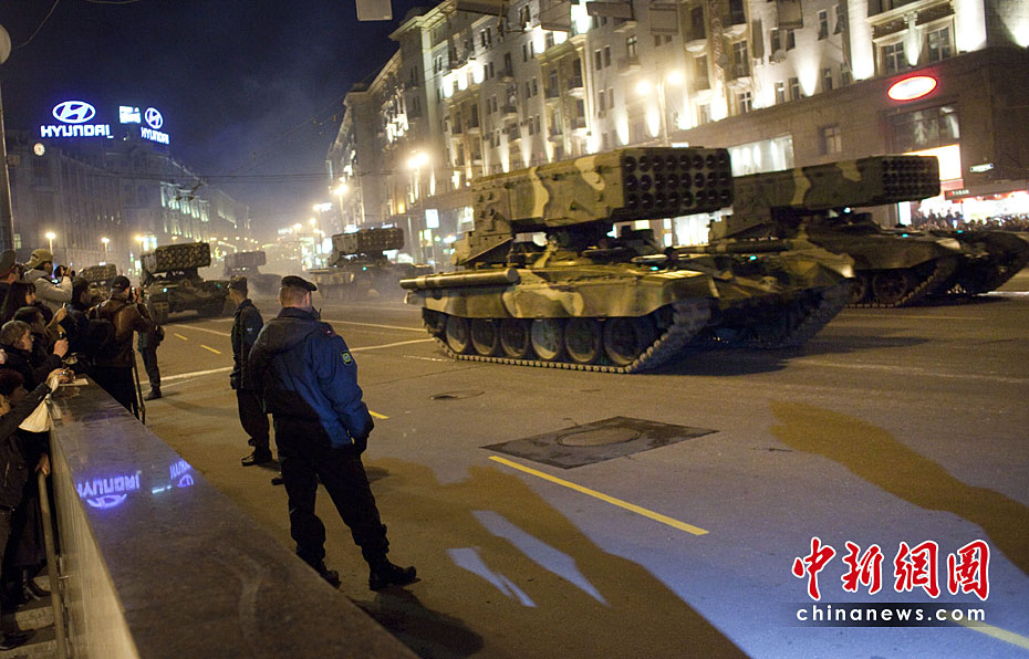 此次红场阅兵包括两部分内容:历史部分和现代部分。历史部分由身穿卫国战争时期军服的士兵在鹅卵石道上进行,同时还会有9辆T-34坦克和8辆SU-100自行火炮。现代部分由13辆老虎装甲车、BTR-80装甲车、BMP-3步兵战车、T-90A坦克和S-400防空系统等。图片来源:中国新闻网
