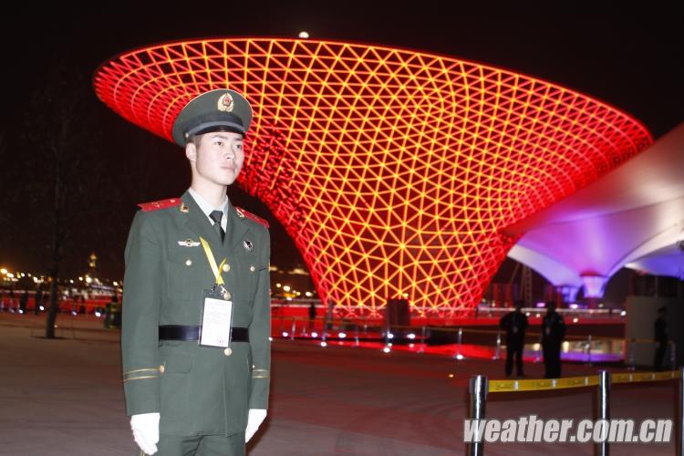 2010年4月27日,上海世博会开幕式彩排顺利进行。图为世博彩排现场坚守岗位的武警战士。卞赟 摄(图片来源:中国天气网)