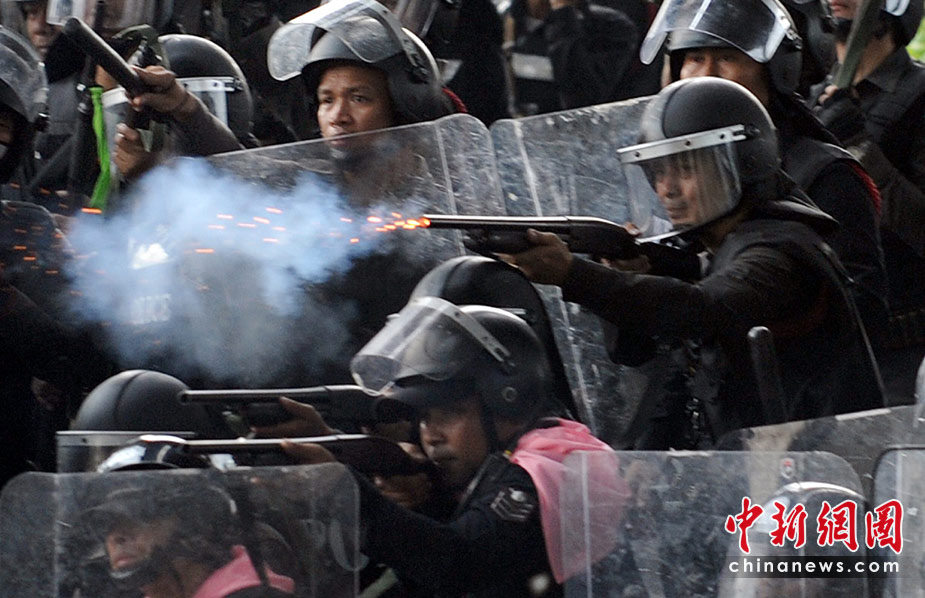 泰国防暴警察与红衫军示威民众28日下午爆发冲突,1名士兵头部被击中身受重伤,10名示威民众受伤送医。