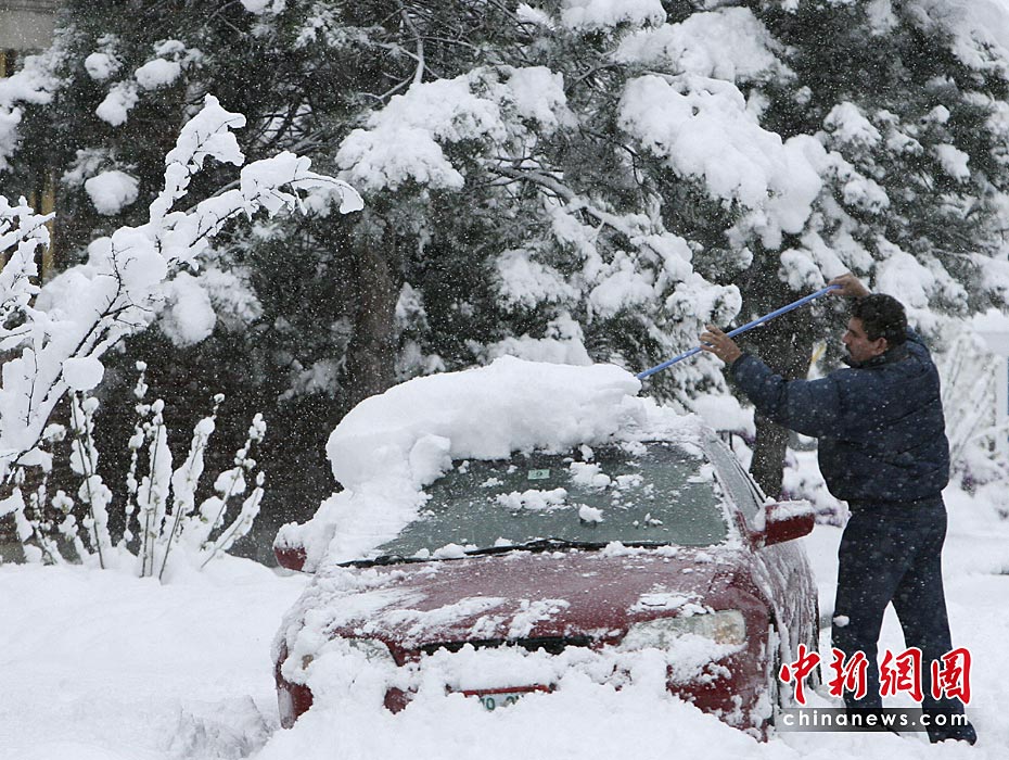 当地时间4月28日,美国佛蒙特州部分地区遭大雪袭击。这场大雪给人们的出行带来不便。图片来源:中国新闻网