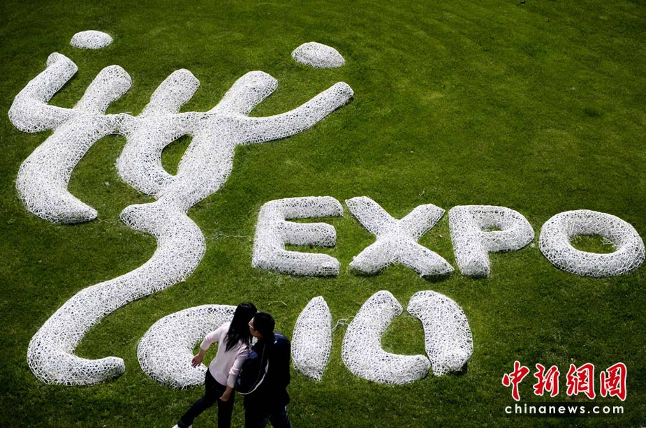 4月29日,上海静安区草坪上的世博会会徽和一对情侣。世博会开幕前,面临“大考”的上海充满喜庆气氛。 中新社发 廖攀 摄