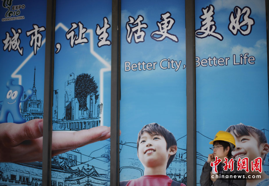 4月29日,上海一名建筑工人站在世博会宣传海报前。世博会开幕在即,面临“大考”的上海充满喜庆气氛。中新社发 盛佳鹏 摄