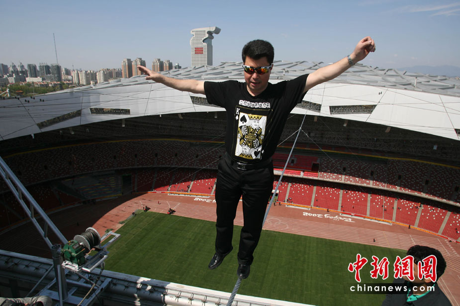 4月29日,有高空王子之称的新疆小伙阿迪力在鸟巢上空成功试演达瓦孜(高空走钢丝)。5月3日起,他将在北京国家体育场(鸟巢)顶棚上搭建的小屋生存60天,其间每天将进行约5个小时的高空走钢丝表演。 中新社发 苏丹 摄