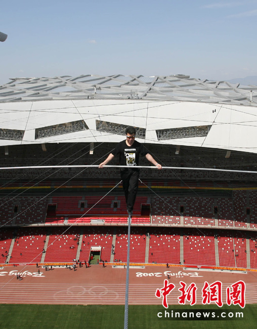 4月29日,有高空王子之称的新疆小伙阿迪力在鸟巢上空成功试演达瓦孜(高空走钢丝)。5月3日起,他将在北京国家体育场(鸟巢)顶棚上搭建的小屋生存60天,其间每天将进行约5个小时的高空走钢丝表演。 中新社发 苏丹 摄