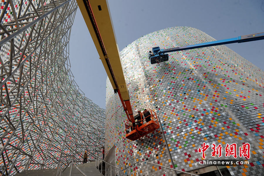 4月29日,工人在对拉脱维亚馆的外墙进行美化。秦淮 摄