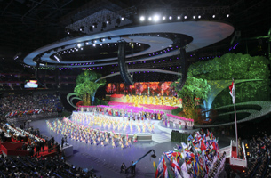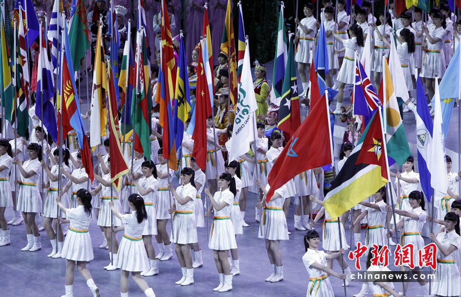 4月30日,中国2010年上海世博会开幕式在上海世博园世博文化中心举行。图为参展方旗帜方队入场。中新社发 汤彦俊 摄