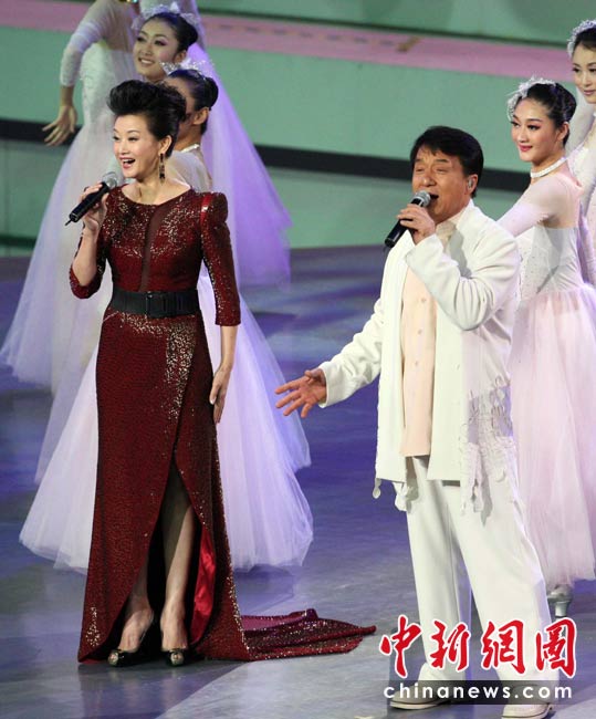 4月30日晚,上海世博会开幕式在世博文化中心举行。图为宋祖英、成龙联袂献唱。中新社发 汤彦俊 摄