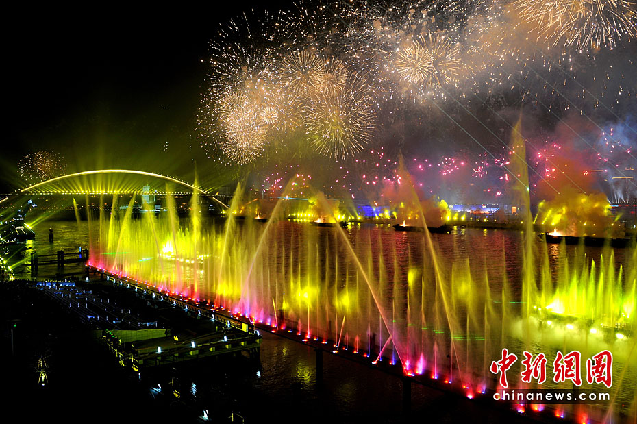 4月30日晚21时28分,在世博会焰火灯光表演开始。万千烟花争奇斗妍,黄浦江两岸绵延3.28公里同时奏响火树银花不夜天的华彩世博乐章。图片来源:中国新闻网