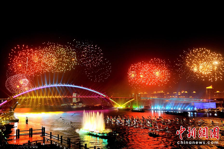 4月30日晚,中国2010年上海世博会开幕式大型灯光喷泉焰火表演在上海举行。图片来源:中国新闻网