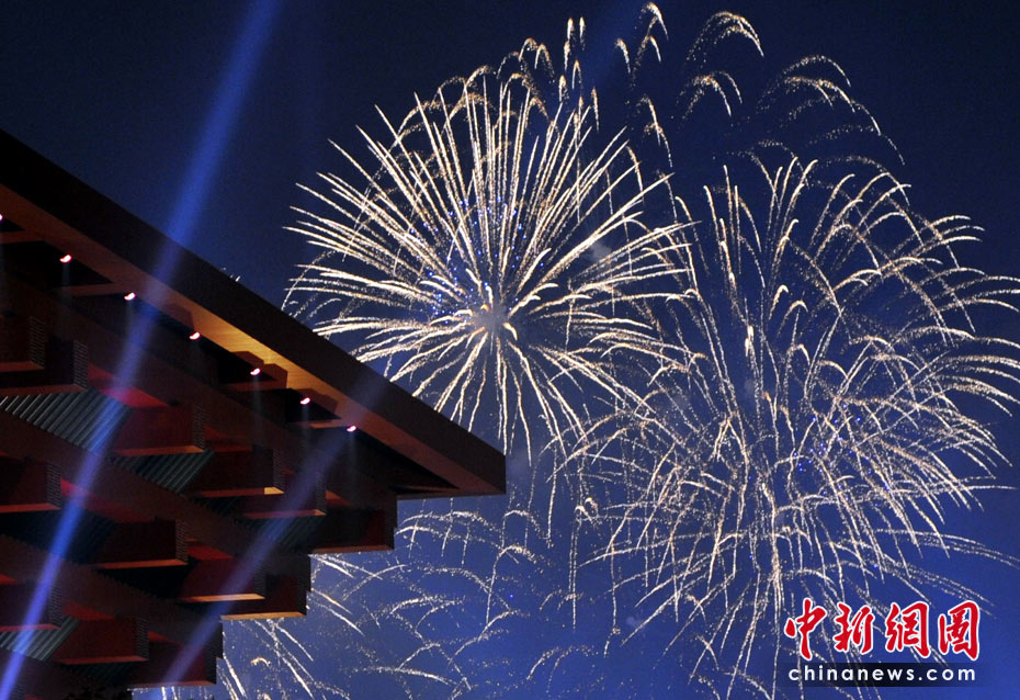 4月30日晚,2010年上海世博会开幕式在上海世博园世博文化中心举行。21时28分,世博会焰火灯光表演开始。黄浦江两岸绵延3.28公里同时奏响火树银花不夜天的华彩世博乐章。中新网记者 王红纲 摄